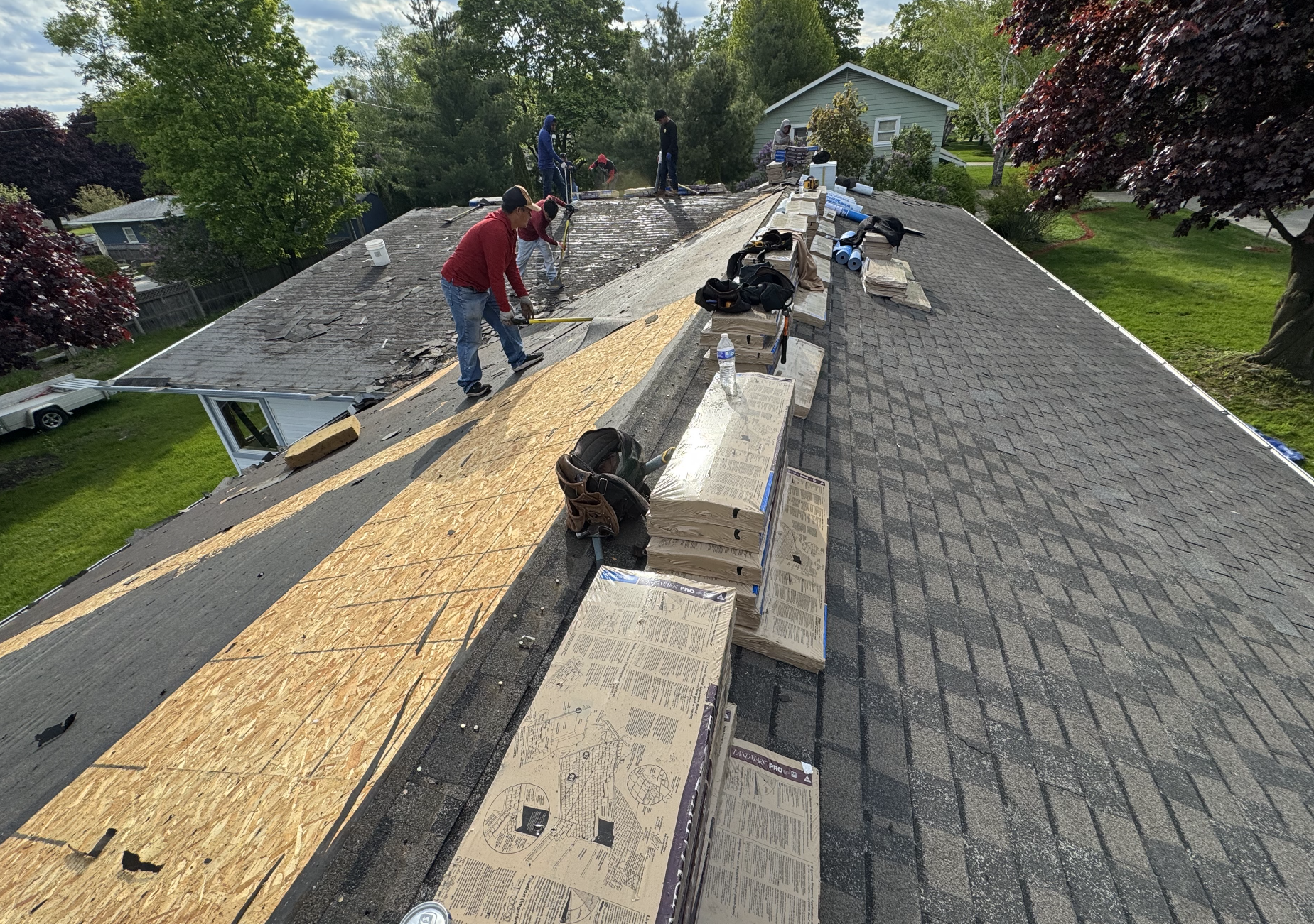 After performing a full tear-off of both layers, we replaced the damaged decking and installed a new roofing system designed to properly protect the home from northern Michigan weather. The finished project left the homeowner with a reliable, long-lasting roof and peace of mind for their seasonal property.